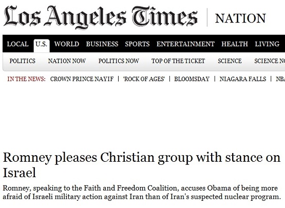 موضوع موضع گیری های ضدایرانی «میت رامنی»، کاندیدای جمهوری خواه انتخابات ریاست جمهوری آمریکا، دیگر به یکی از اخبار معمول رسانه ها تبدیل شده است. در همین رابطه، روزنامه «لس آنجلس تایمز» اقدام به انتشار جدیدترین اظهارات وی کرده که در جمع یک گروه مذهبی محافظه کار بر زبان رانده شده است. وی در این سخنان اوباما را متهم کرده که بیش از آنکه نگران برنامه هسته ای ایران باشد، نگران اقدام نظامی اسرائیل علیه ایران است.