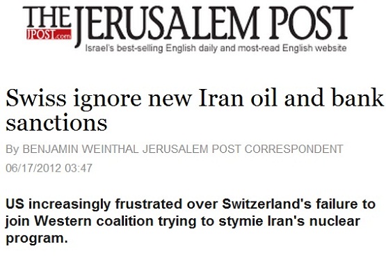 در نهایت، روزنامه «جروزالم پست» از عدم همراهی کشور سوئیس با تحریم های نفتی و بانکی غرب علیه ایران خبر داده و نوشته این امر سبب انتقادهایی علیه این کشور از سوی ایالات متحده شده است. سوئیس پیش از این اعلام کرده به ائتلاف کشورهای غربی برای تحریم بخش نفتی و بانکی ایران نخواهد پیوست. این موضع باعث شده سفیر آمریکا در سوئیس ضمن ابراز ناامیدی از این اقدام، از دولتمردان سوئیس بخواهد در تصمیم خود تجدیدنظر کنند.